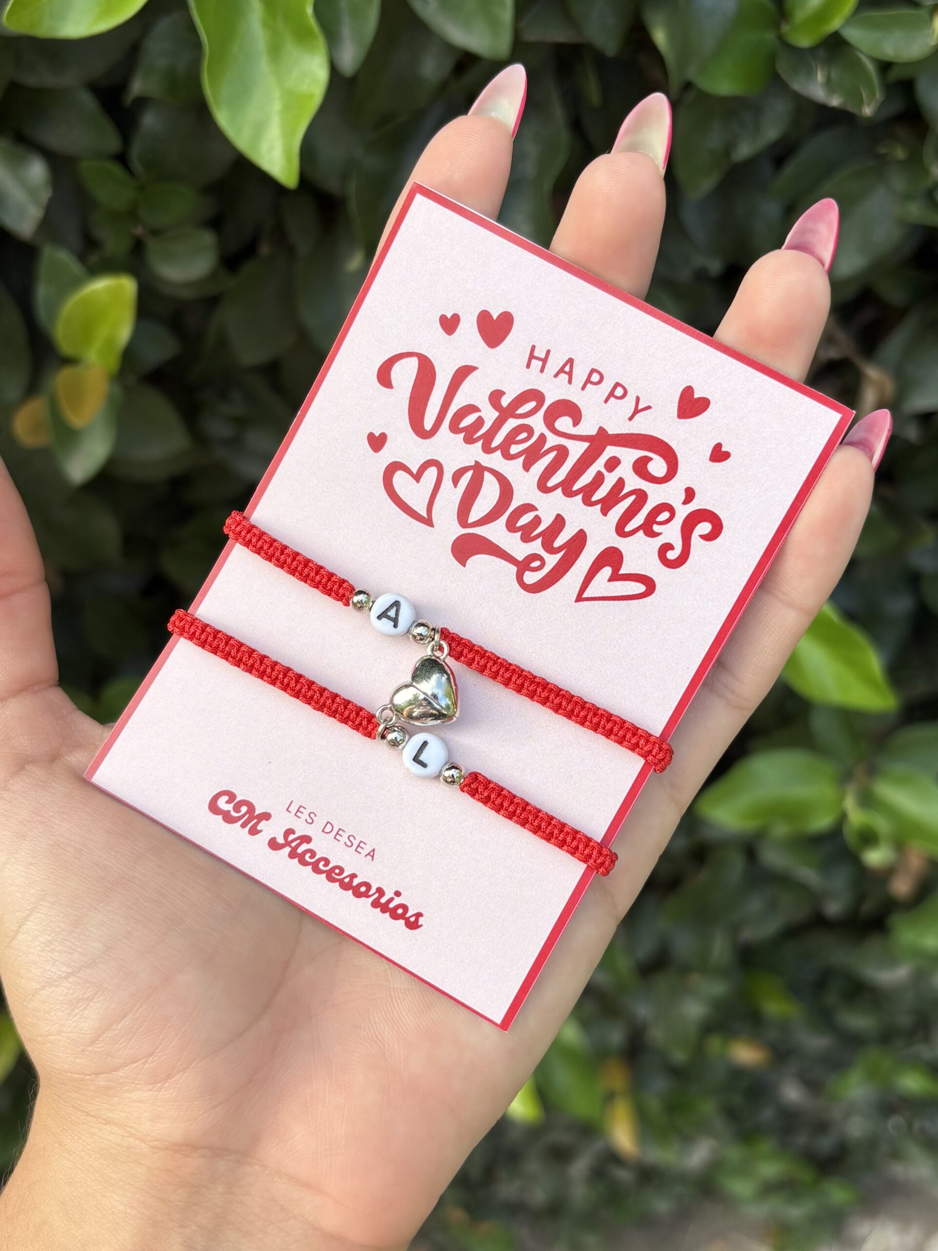 San Valentin -Pulseras macramé mas iman de corazón plateado e iniciales